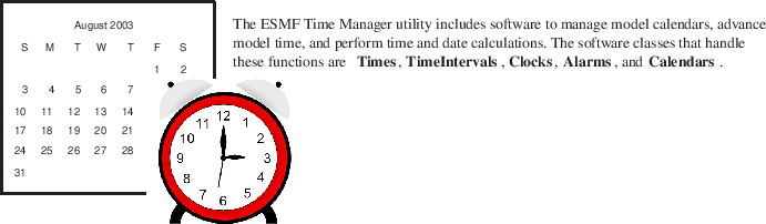 The Time Management Library provides utilities for time and time interval representation and calculation, and higher-level utilities that control model time stepping, via clocks, as well as alarming.
