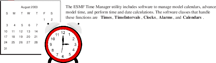 The Time Management Library provides utilities for time and time interval representation and calculation, and higher-level utilities that control model time stepping, via clocks, as well as alarming.